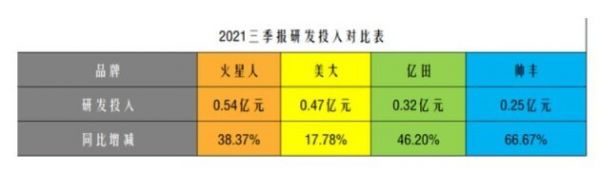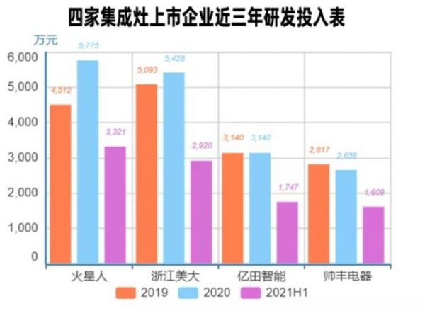 从2021三季报也能看出,四家公司的研发投入都在总体提升。其中,火星人今年上半年研发投入金额为3321万元;浙江美大研发投入金额为2920万元;亿田智能研发投入金额为1747万元;帅丰电器研发投入金额为1609万元,同比增长76.23%,依然是火星人总投入最大。