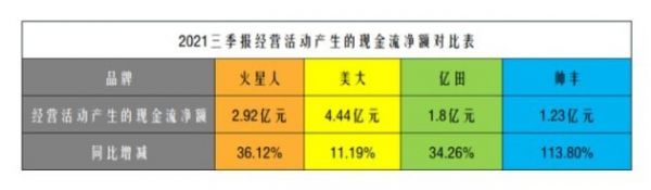经营活动产生的现金流净额反映了一家企业的经营质量以及获取到手利润的数值。通过上表可以看到,四家上市企业经营活动三季度产生的现金流净额均为正值,且同比均有较大幅度增长。火星人2.92亿,同比增长36.12%;美大4.44亿元,同比增长11.19%;亿田1.8亿元,同比增长34.26%;帅丰1.23亿元,同比增长113.80%。可见,四家上市企业运营资金周转比较健康。
