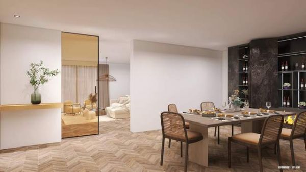 品茶之余,亦不能辜负美食。餐厅的品位也因茶玻全景门而随之提升,木制餐桌和灰棕色座椅,在明朗的线条中寻找到统一的表达,让餐厅多了份难得的亲密感,透过全景门看到的,则是餐厅之外的另一种延伸,空间也由此变得丰盈起来。