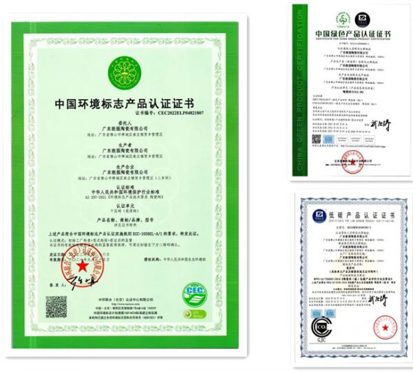 能强瓷砖多年来始终坚持绿色环保观念,致力于健康环保产品的研发与生产。以匠心精神坚守产品品质,先后荣获《中国环境标志产品认证证书》《中国绿色产品认证证书》《低碳产品认证证书》等含金量十足的绿色环保认证。实实在在为消费者的绿色生活保驾护航。