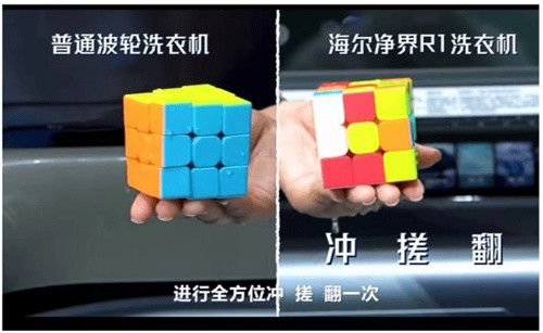 在现场,工作人员通过将两个原始状态的魔方分别放入普通洗衣机和海尔净界R1中来展示它们之间的区别。一分钟的清洗过后,普通洗衣机中的魔方仍保持原始状态,而在海尔净界R1中的魔方则已经被彻底打乱
