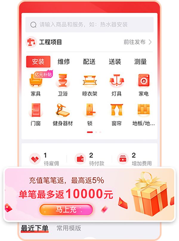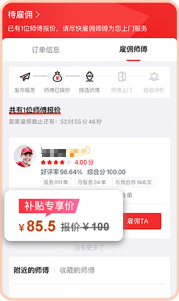 当你要找家具安装/量尺师傅的时候,只要你下单,平台的补贴优惠单笔最高就可以给到你20%的优惠,而送装/维修则省了更多,单笔优惠最高直接能省下35%了,这还不包括你下的比价订单,师傅抢单给你报价,你自己挑选的高性价比价位师傅省下的钱,我就问你,这波省钱攻略你爱了没?
