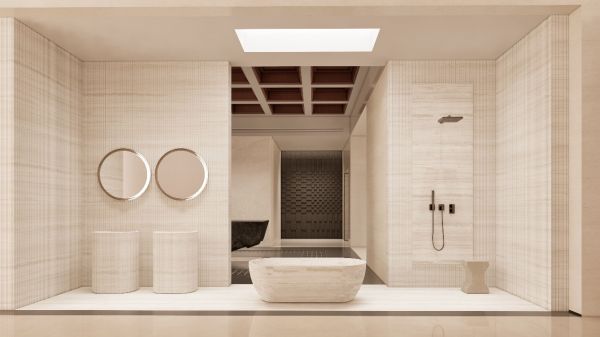 最为惊喜的是,罗意威首次在石材行业推出了整体空间定制的产品和服务。罗意威的石材应用理念,不再是单纯提供视觉的上的装饰,更是在肌理设计上解决了功能和美学的问题,从空间的天、地、墙设计到灯光设计,以及配件和单品的设计,最终呈现一个石材定制空间。