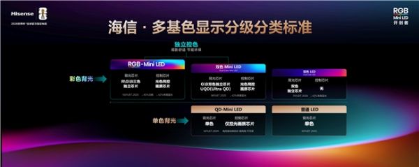 现在RGB-Mini LED热度非常高,全球主要电视厂商都在积极跟进,市面上除了海信已量产机型外,还有其他厂商推出的同类产品。为了让消费者享受到真正的RGB三原色超高清画质,海信以开创者和技术引领者身份明确定义“RGB-Mini LED必须同时具备RGB独立发光芯片和光色同控独立画质芯片”,并且列出了多基色显示分级标准,给产业健康发展提供了方向指引。