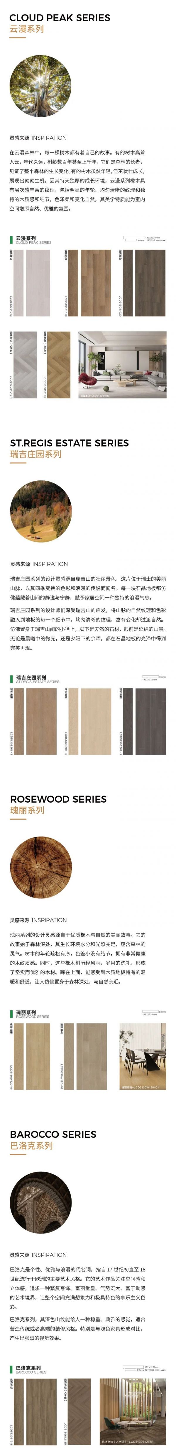 石晶地面系统有“云漫系列、瑞吉庄园系列、瑰丽系列、巴洛克系列”,纹理、花色与质感丰富多元,全面满足高端设计与个性化空间的营造需求。