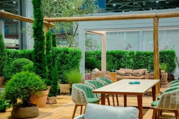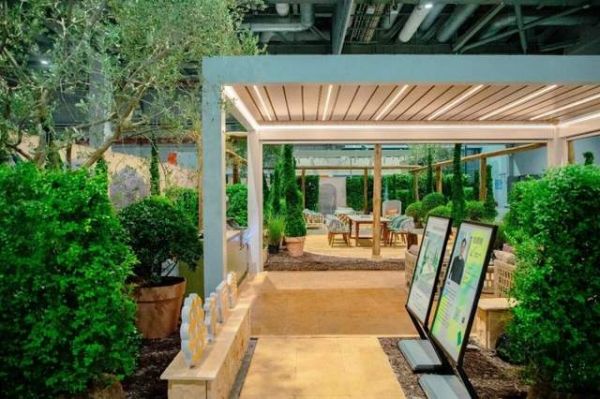 在这个花园生活体验中心内,TOSCANA的室外电动翻转百叶篷(PERGOLAM)巧妙地融入场景设计中,与绿植、光影共同构筑出一个半开放的休闲空间。这个空间的独特之处在于,它既保持了与自然对话的开放性,又通过精妙的设计赋予了场所应有的私密与舒适,让观展者能够沉浸式体验室外生活的静谧与美好。