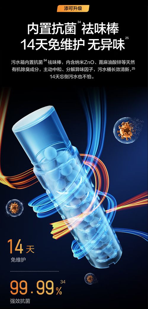 传统洗地机最大的痛点之一,就是污水箱清理不及时便会散发难闻的异味。添可创新性地在污水箱中内置了“抗菌祛味棒”。其内含的纳米ZnO等天然有机除臭成分,能主动中和、分解污水中的异味因子,并长效抑制细菌繁殖,污水桶保持清新无异味。