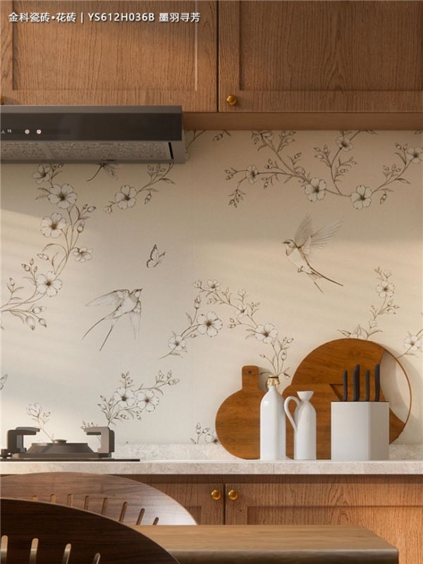 氛围秘诀:一定要在橱柜下或天花加装灯带,灯光一打,墙上的花鸟会有朦胧的光影,绝了!