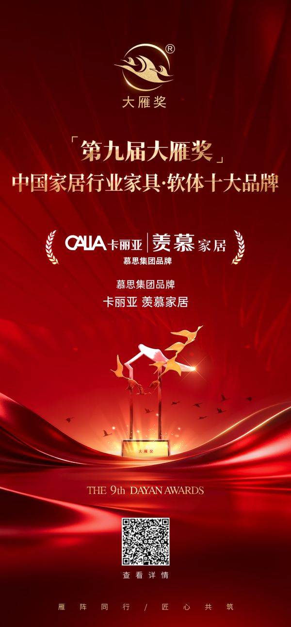 1月30日,「第九届大雁奖」获奖名单于云端发布会正式揭晓。慕思集团品牌CALIASOFART卡丽亚、羡慕家居凭借其在家具·软体领域的卓越产品力、领先的品牌影响力与持续的市场引领表现,荣获“第九届大雁奖·中国家居行业家具·软体十大品牌”这一细分领域的权威殊荣。