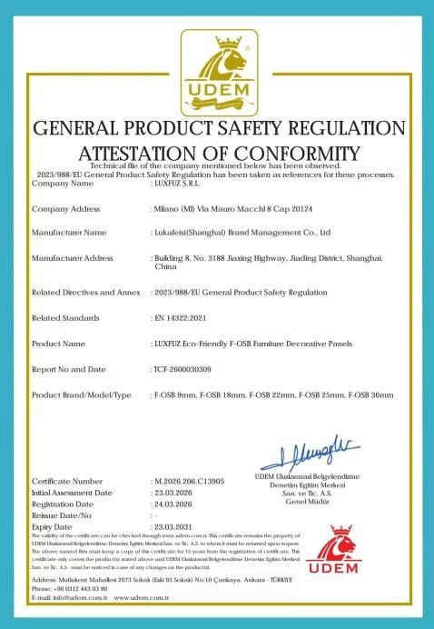 目前,LUXFUZ卢卡菲斯已将其深耕欧洲二十余年的高定板材产品与材质哲学引入中国市场,由卢卡菲斯(上海)品牌管理有限公司作为中国区独家运营商,构建以意大利研发、欧洲制造为核心的全球供应链服务体系。此番再次斩获2026年度全新欧盟CE认证,也为品牌在中国及全球高端家居与建筑项目中,提供了更具时效性与公信力的品质支撑。