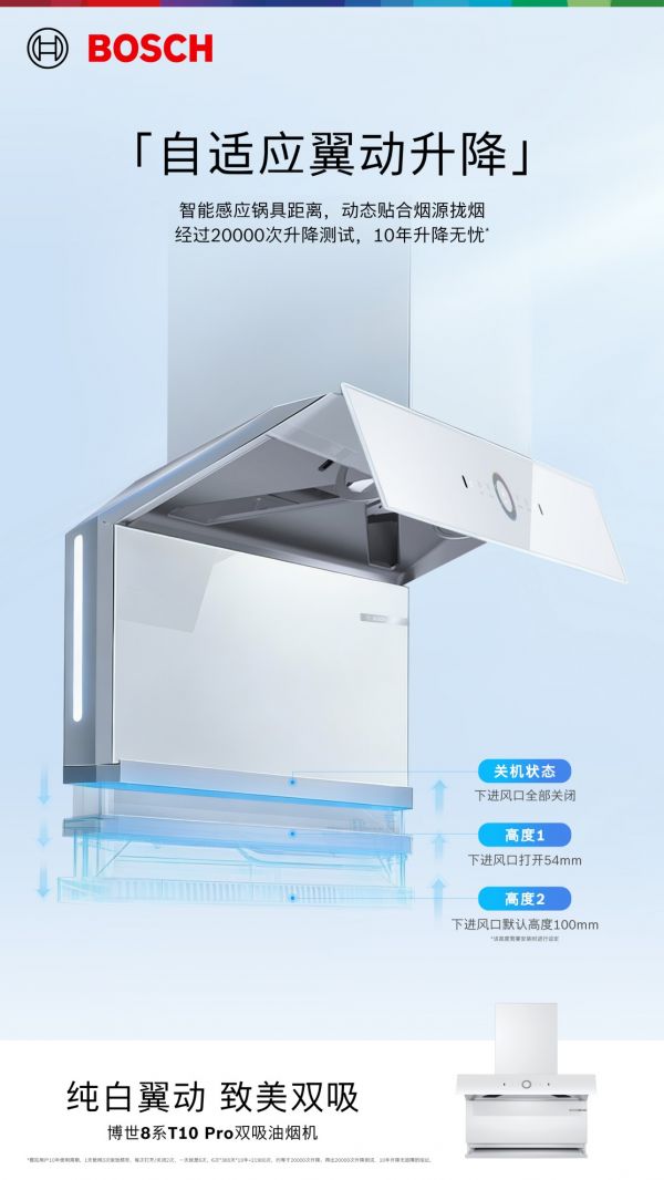 针对中式厨房油烟量大、扩散快、易扑脸的痛点,博世 8 系 T10 Pro 搭载全新强拢双吸设计,上天幕广域覆盖、下地网精准锁源,形成立体合围式吸烟屏障,拢烟率高达 99.6%1;搭配自适应翼动升降系统,可主动贴近烟源掠吸,真正实现 “油烟未起,吸力已至”,从源头杜绝油烟逃逸。