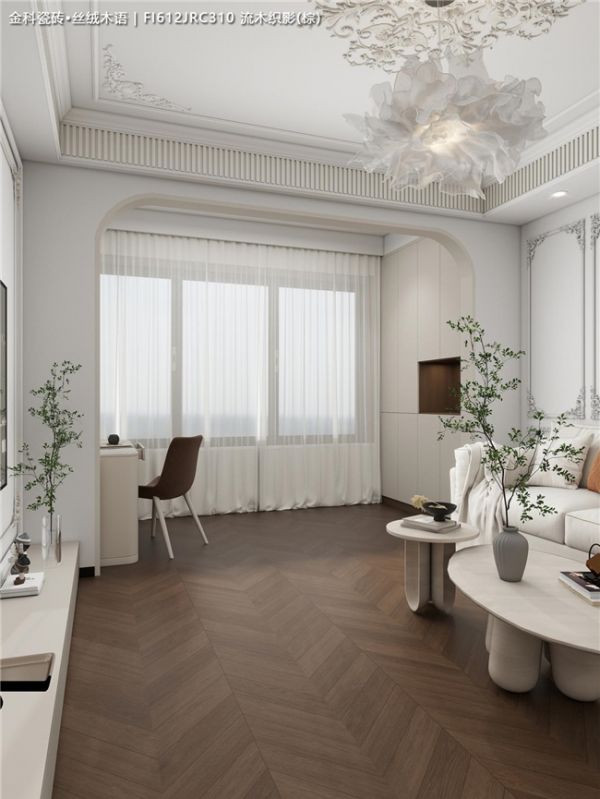 我选的这款木纹砖,纹理非常逼真自然,有细腻的木材肌理和恰到好处的色差,哑光质感温润柔和。它精准复刻了实木鱼骨拼的效果,但又比实木更耐磨、更好打理,不怕潮湿和地暖,是美貌与实用性兼顾的满分选择。