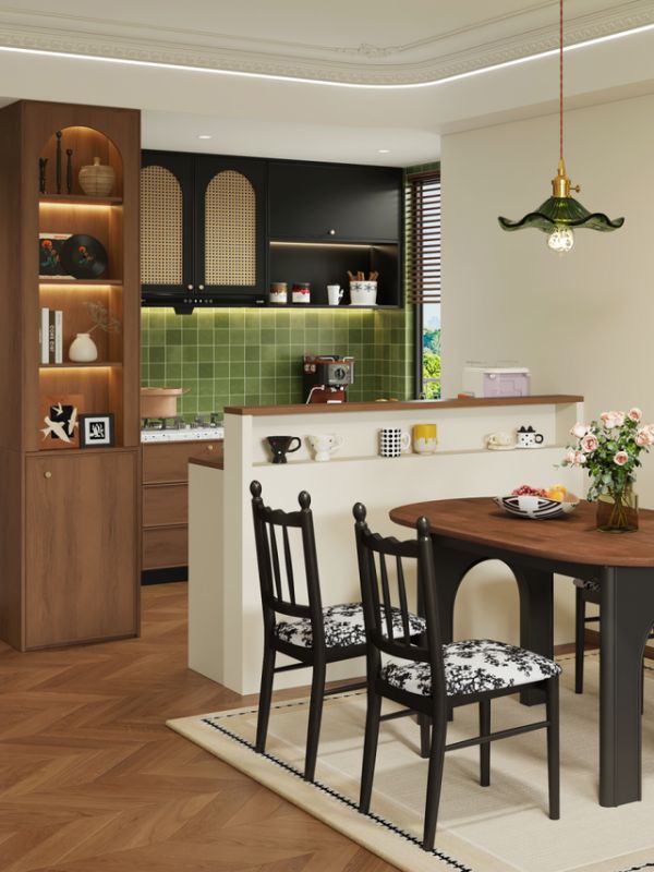 餐边柜采用墨绿色墙砖搭配可可木棕,法式餐桌与黑白提花餐椅共同营造出优雅复古的用餐氛围。餐桌与厨房之间定制吧台,集隔断、休闲、出餐、收纳功能于一体。