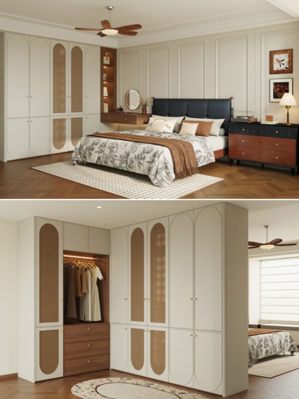 护墙板与中古家具搭配,氛围感十足。L型转角衣柜兼顾床头柜功能,靠窗定制梳妆台与储物柜,每一寸空间都不浪费。