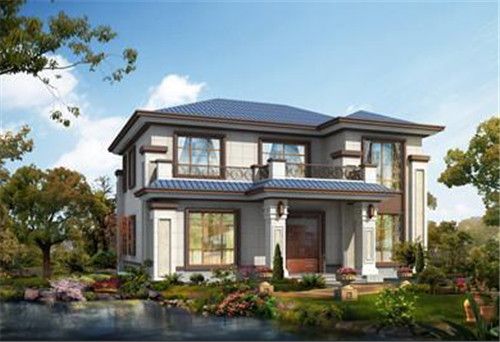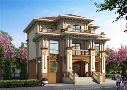 这款房屋采用的是欧式设计风格,一层棕色真石漆+二三层米黄色真石漆,再配上欧式的构件,既能展现出欧式时尚大气的气息,又能展现出别墅的结构层次。屋顶是橘红色的琉璃瓦,清新又时尚。门前方形的罗马柱+二三层的小罗马柱装饰,则可以让房屋看起来更加的庄严气派。