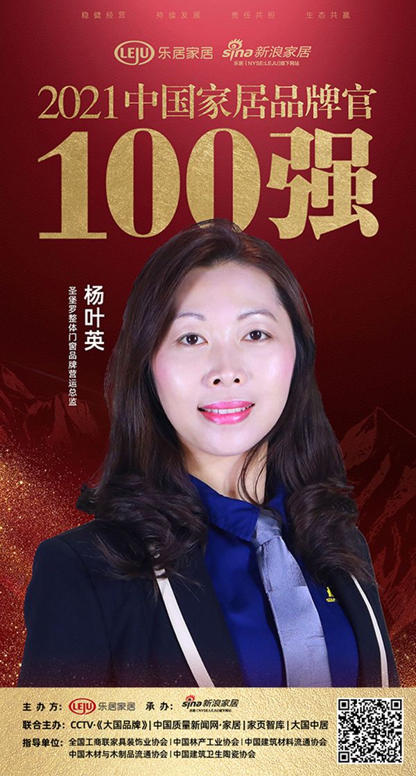 新浪家居 2021年12月18日,“智见•2021中国家居新时代盛典暨金致奖颁奖典礼”在广东佛山盛大启幕。由乐居家居主办、新浪家居承办,CCTV•大国品牌、中国质量新闻网•家居、家页智库、大国中居联合主办的「2021中国家居品牌官」评选在盛典隆重揭晓。圣堡罗整体门窗品牌营运总监杨叶英荣膺「2021中国家居品牌官100强」称号。